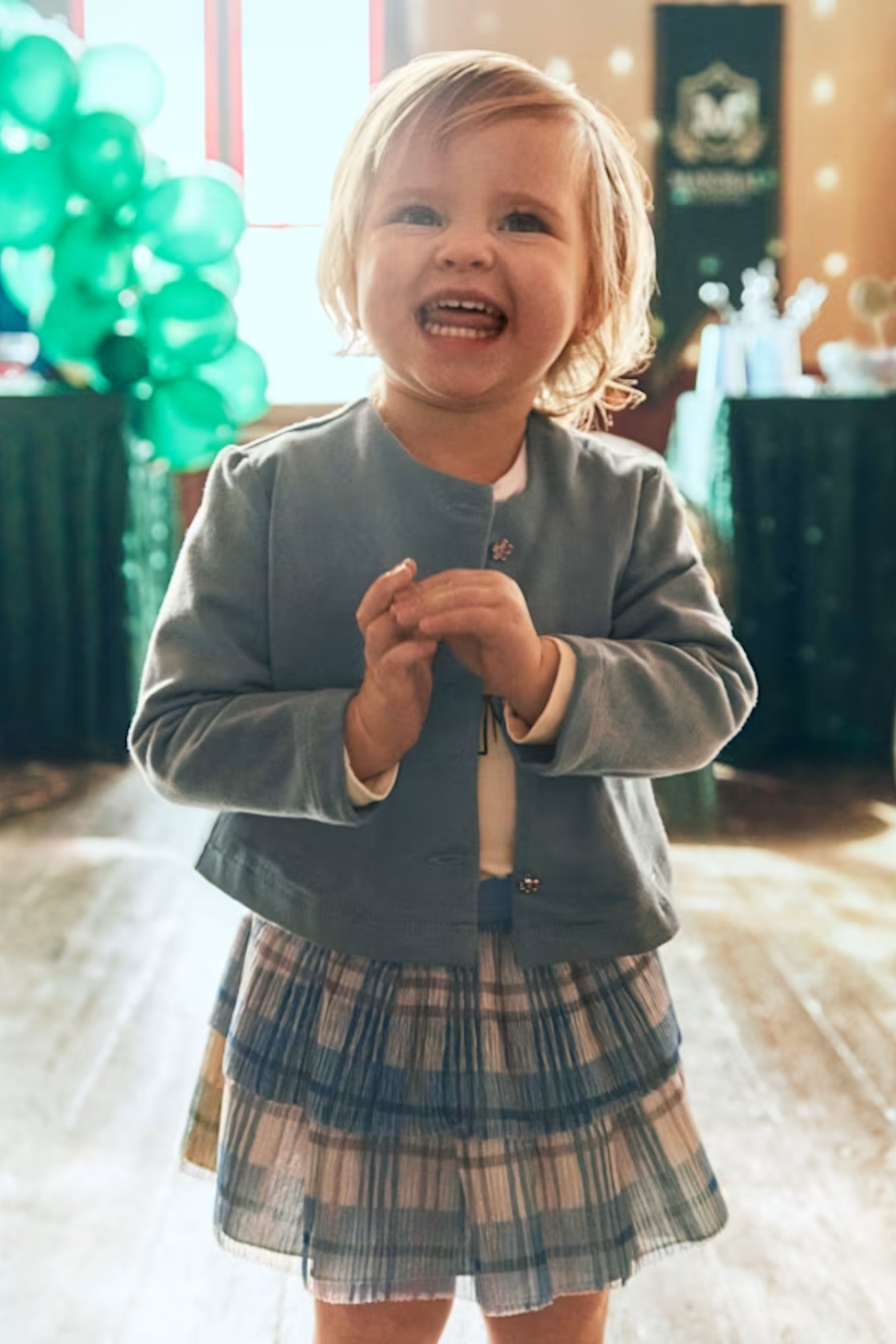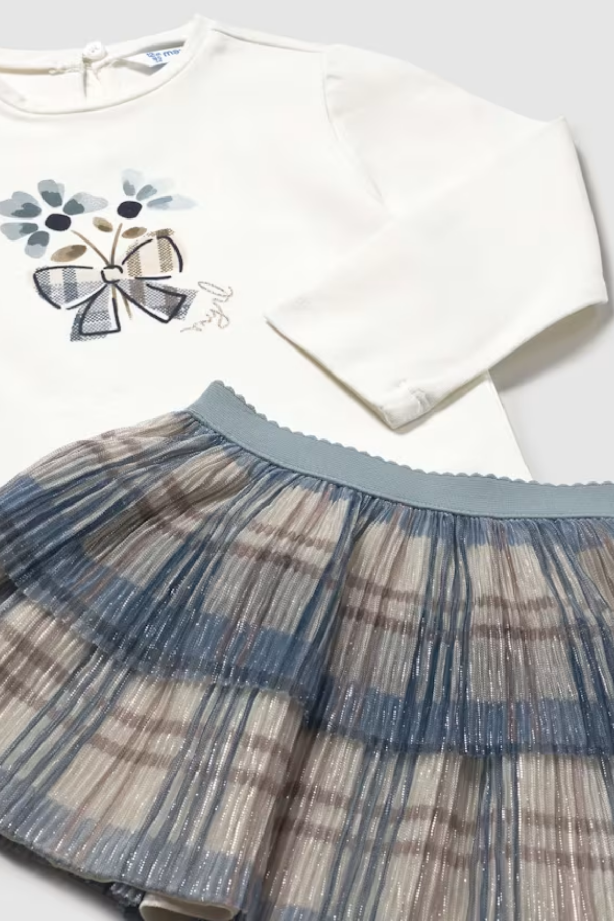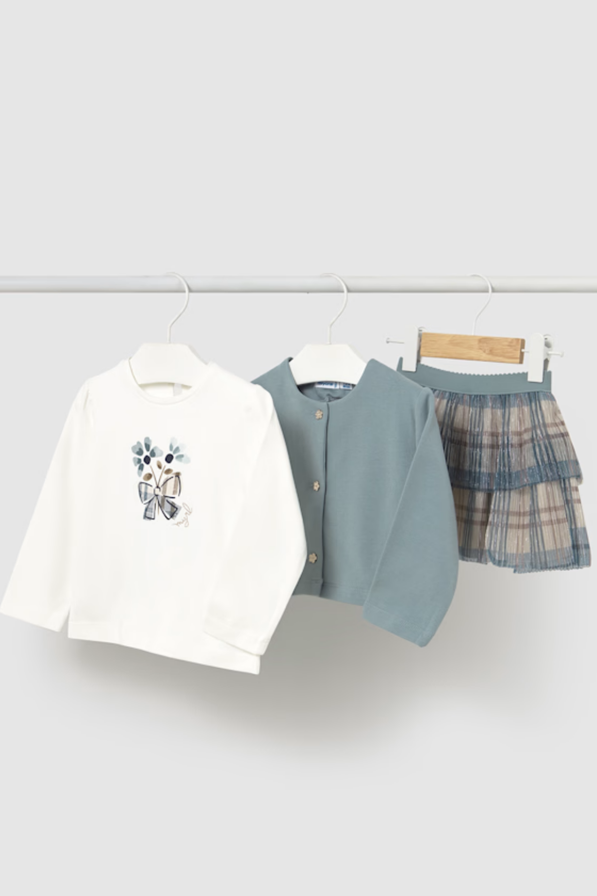 Bebekler için hırka, tişört ve etekten oluşan üç parçalı set.
