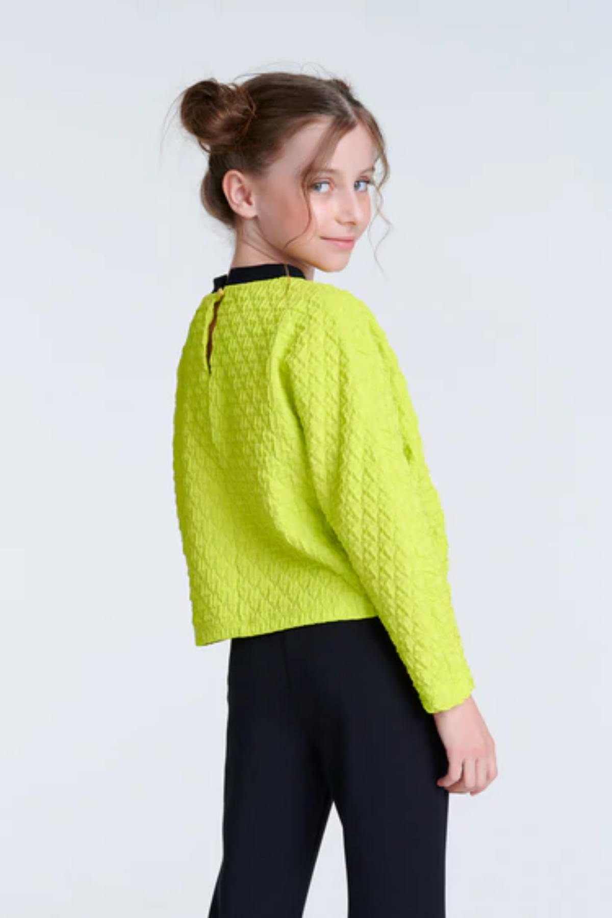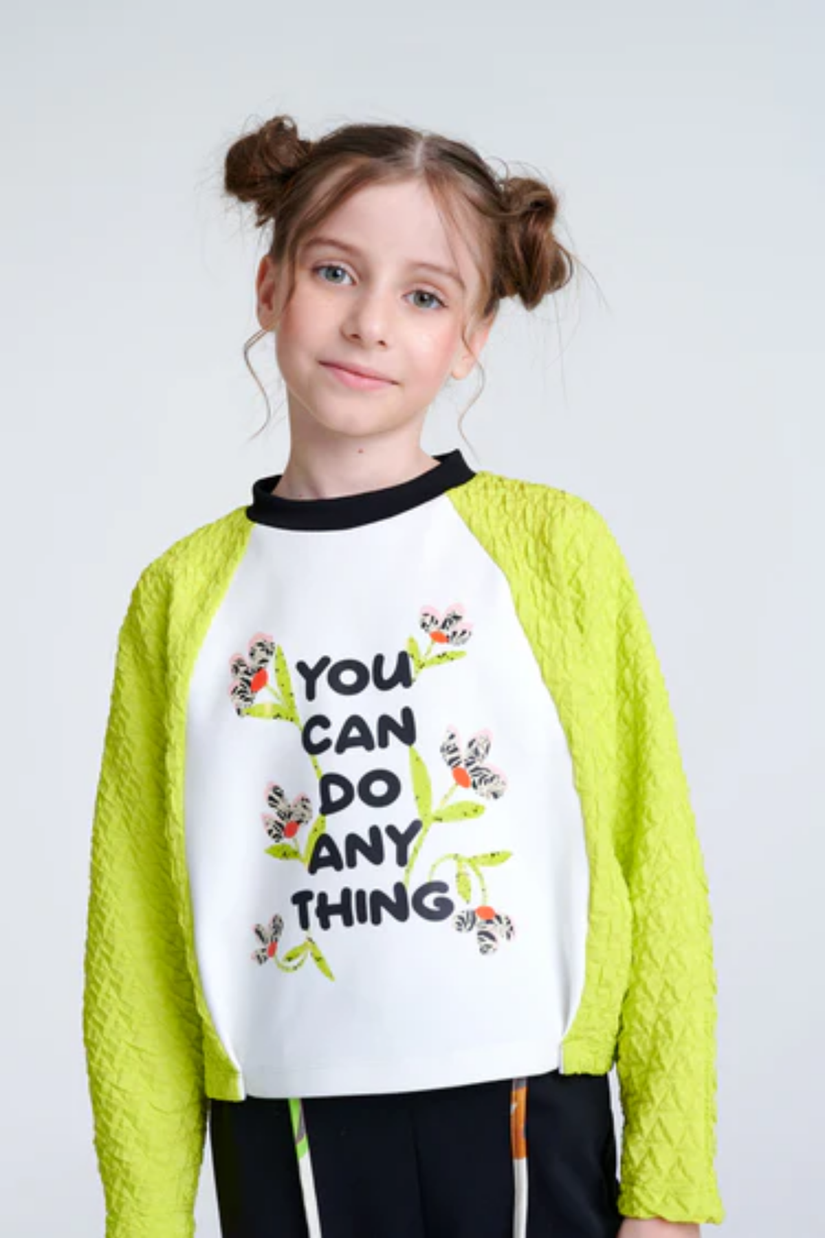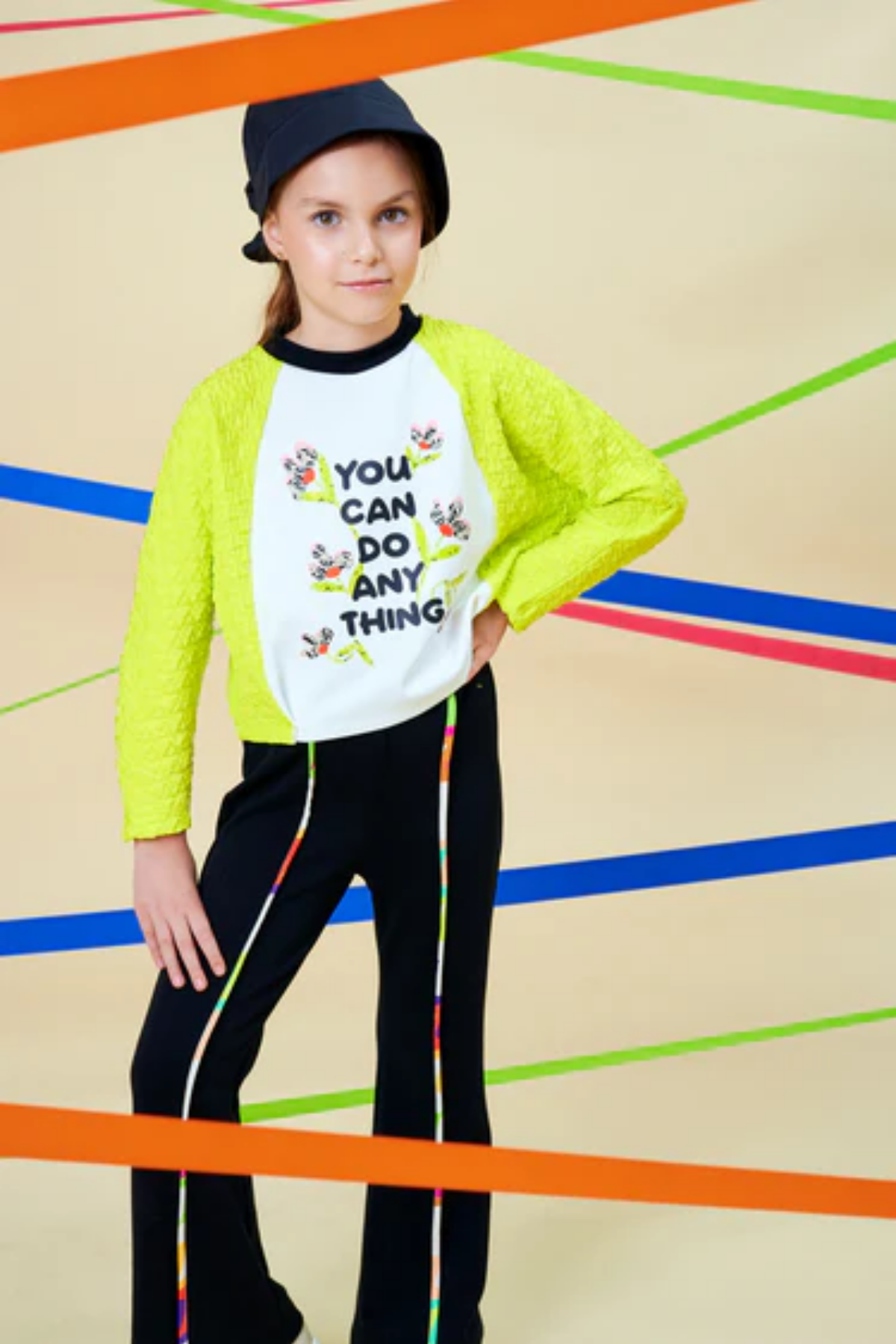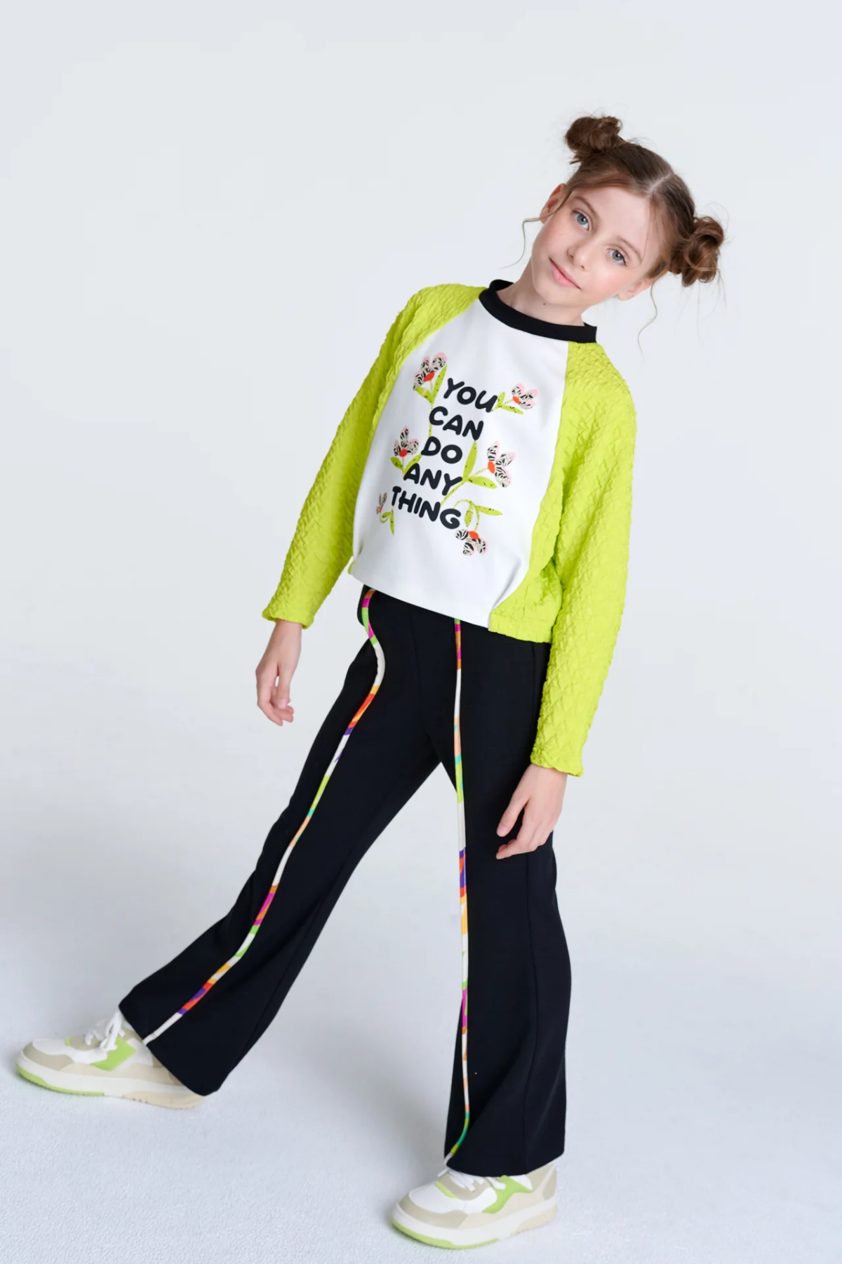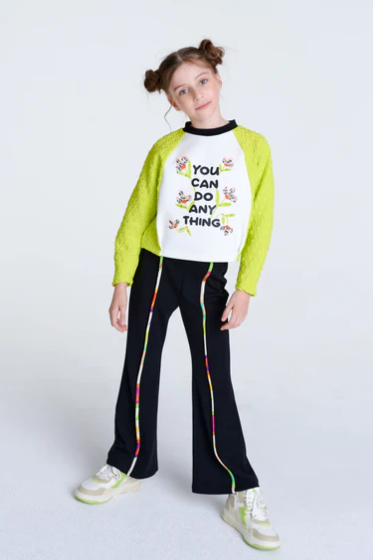 Neon yeşil ve bej tonlarında tasarlanmış eşofman üstünün göğsünde yazı detayı vardır. Alt kısmı ise yine örme kumaştan ve siyah renkte biye detaylıdır.