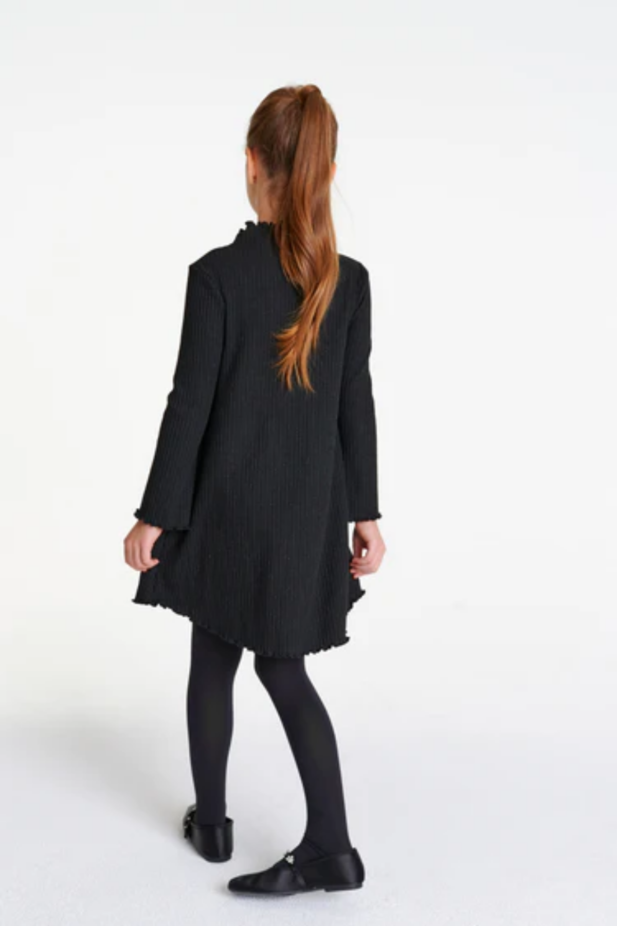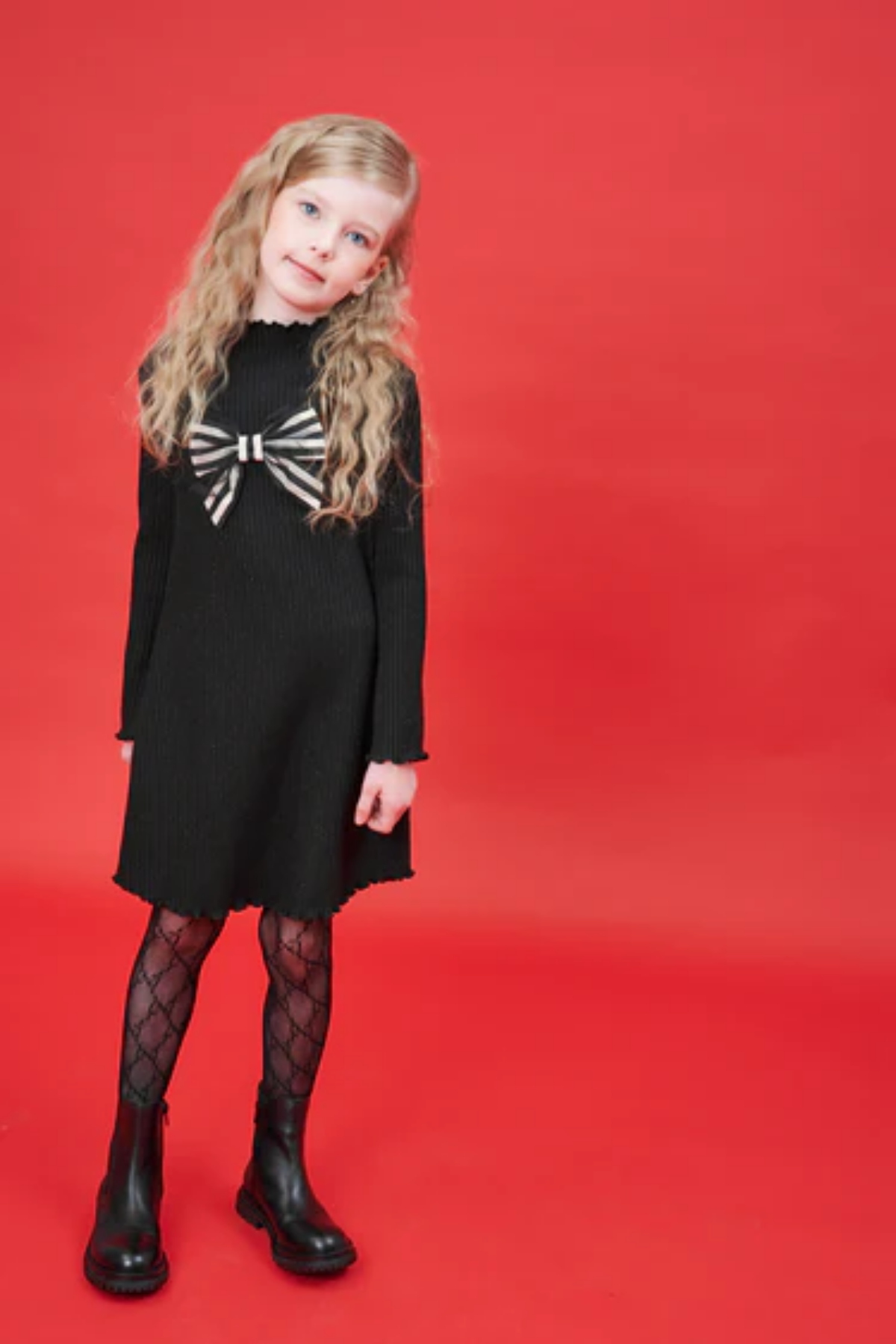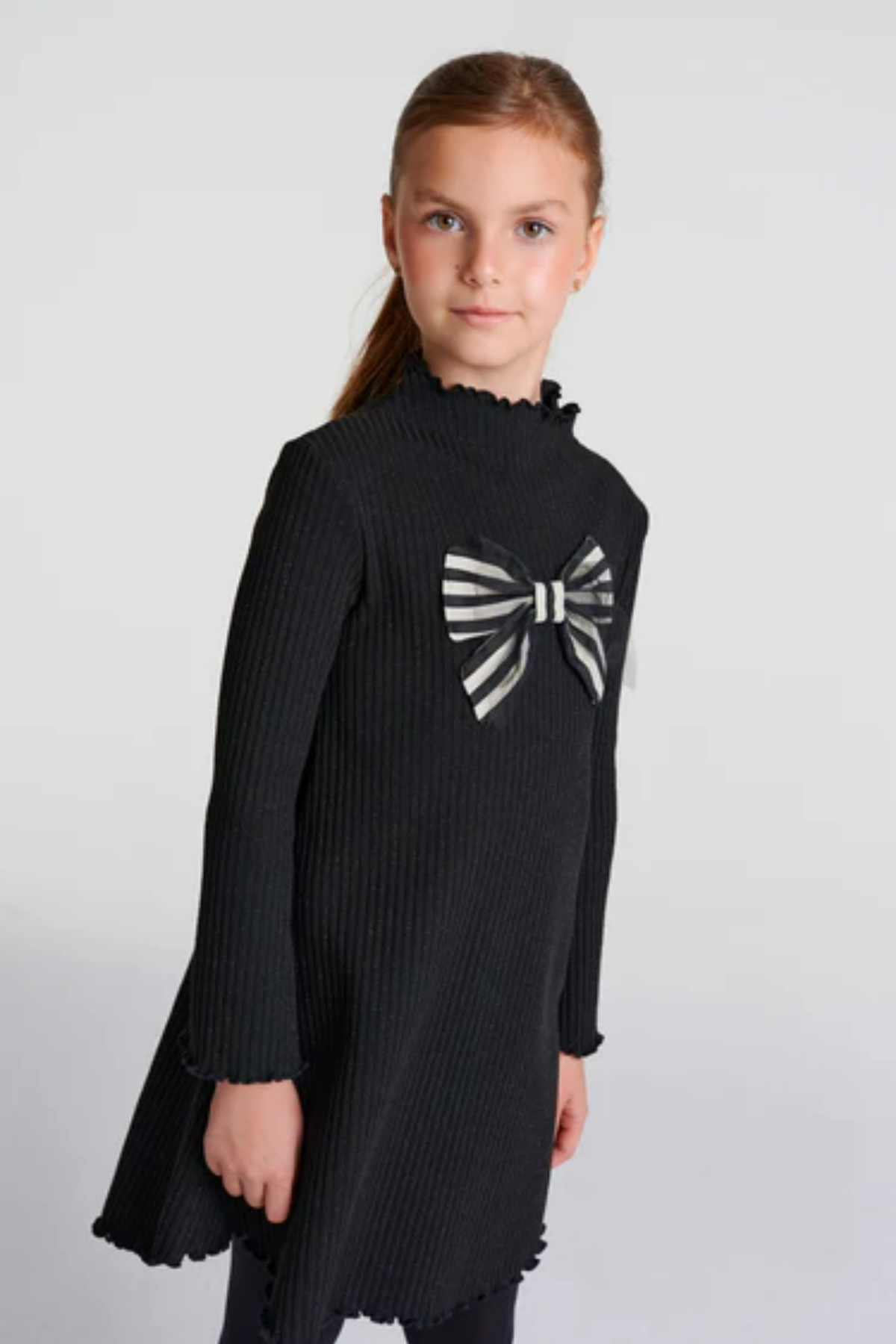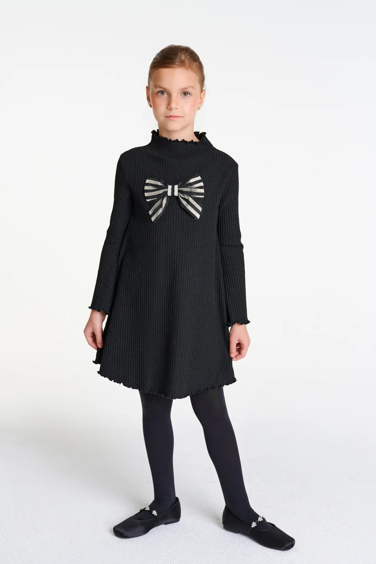 Ribana örme kumaştan tasarlanmış rahat kalıp kız çocuk elbise, göğsünde yine örme kumaştan fiyonk detayı vardır.