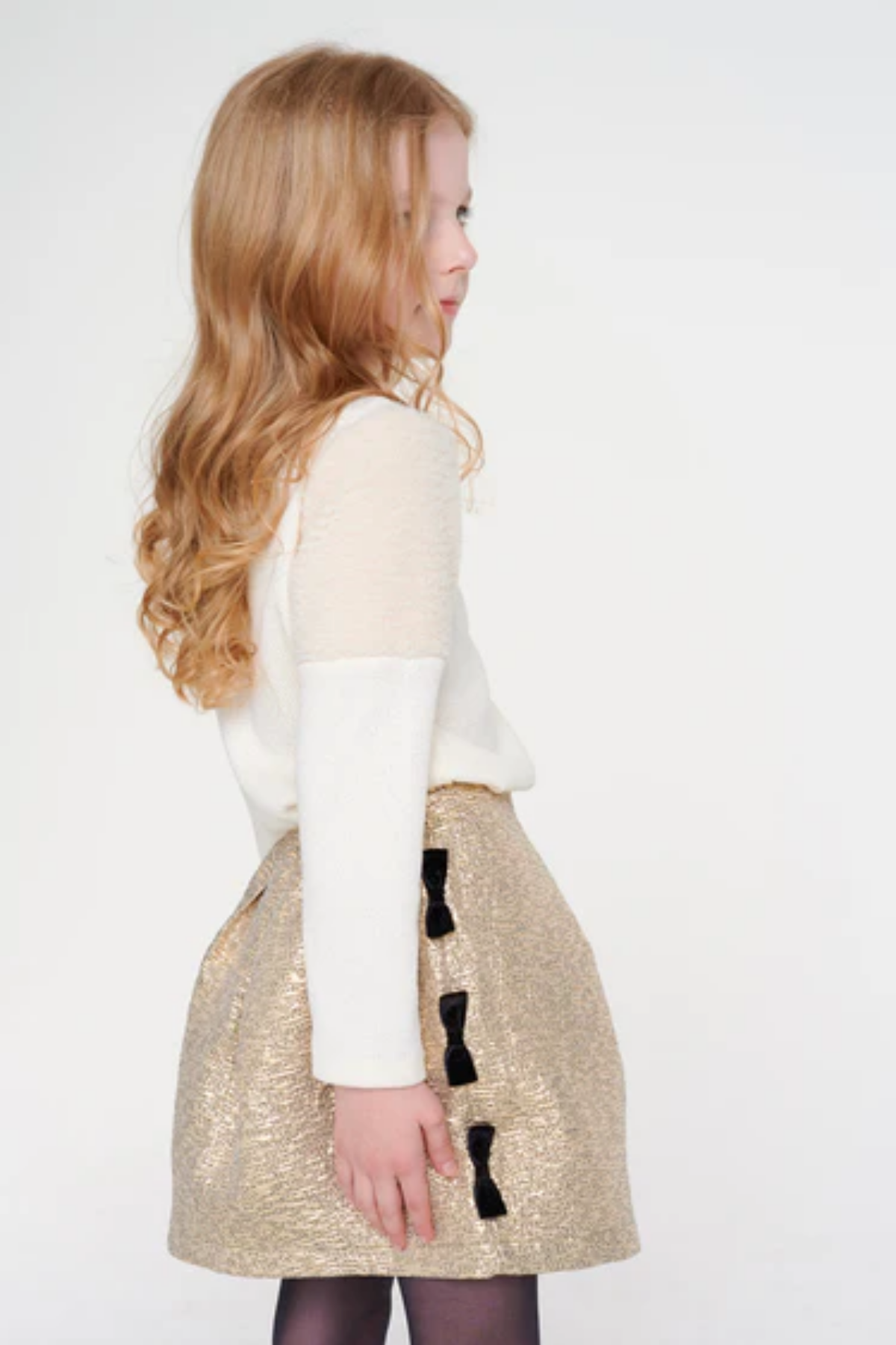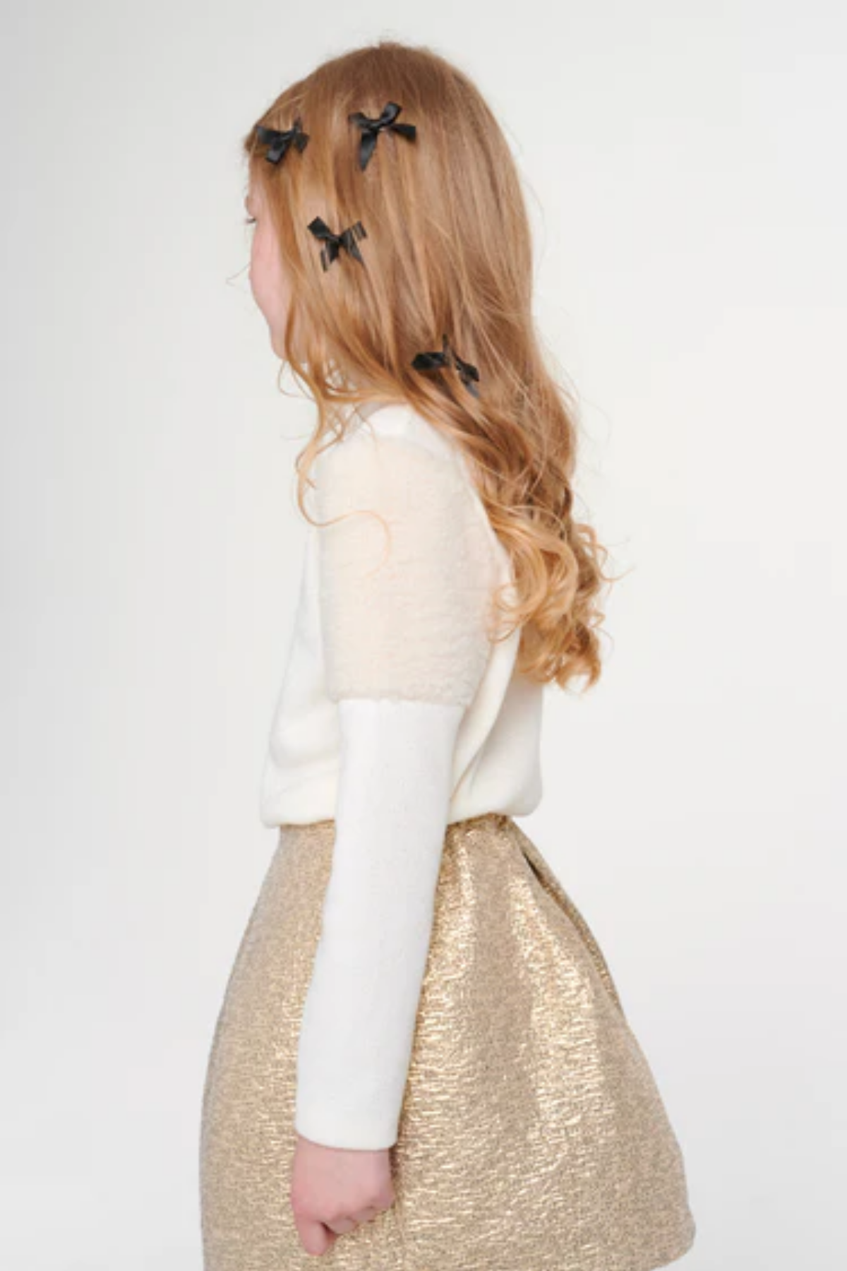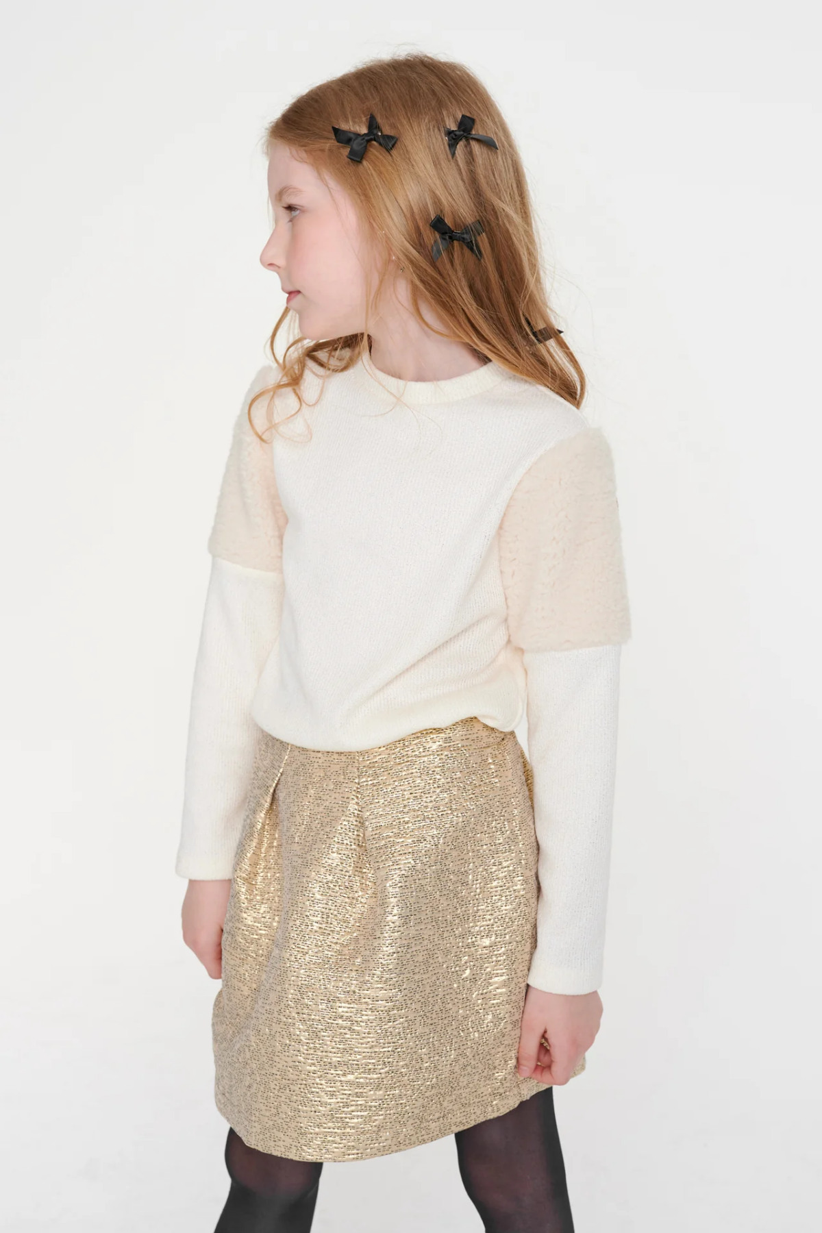 Krem rengi örme kumaştan tasarlanmış sweatshirt'ün kollarında suni kürk detayları vardır. Takımın eteği ise altın varak parlak kumaştan tasarlanmıştr. Yanlarında üçer adet kadife fiyonk aksesuarları bulunmaktadır.